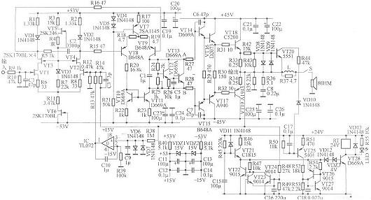 V4、VR和R9接在V3、V5集電極之間構(gòu)成Vbe擴(kuò)大電,調(diào)節(jié)VR可改變末級大功率管的靜態(tài)工作電流。V4還起度補(bǔ)償作用,當(dāng)功率管的溫度升高時(shí),V4的發(fā)射結(jié)壓降小,于是V4的集電極一發(fā)射極電壓也降低,從而降低了功管的靜態(tài)電流,作用與二極管相似,但比二極管更靈,安裝時(shí)應(yīng)與功率管一起裝在散熱器上,電氣上要絕。