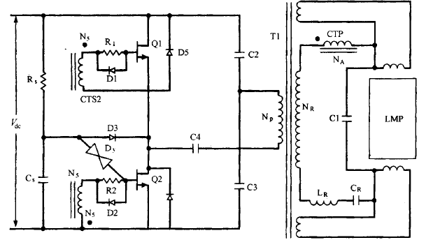 在導(dǎo)通霎時就是由于較低的尺而招致了電流沖擊。在燈點(diǎn)亮以 后,燈管的阻抗會降落 ,Q 增加,R,也增加,從而電流就會調(diào)整為預(yù)定功率時的輸出值 。電流變壓器的初級調(diào)和振電感Lr、諧振電容Cr相串聯(lián),這樣增加了導(dǎo)通阻抗,有利于在開端的時分降低電流的沖擊。電流變壓器是基極比例驅(qū)動變壓器(8.3.5節(jié))。其臣比NA/N,設(shè)計(jì)為最小的晶體管P值。這通常確保了在一切的電流程度下都有足夠的基極驅(qū)動。由于極電極和基極的電流比剛好就是變壓器的臣比,這會保證在高電流輸出下有足夠的基極驅(qū)動,而在低電流輸出時則能夠降低基極驅(qū)動以減少存儲時間。剛開端導(dǎo)通時,電路的振蕩頻率是 1/(卻在刃,Ce 是 Cr和Cl的串聯(lián)值,其值為ClCr/(Cl+Cr)。當(dāng)燈管點(diǎn)亮?xí)r,由于Cl與較低的阻抗并聯(lián),所以電路的諧振頻率降為 1/(勿在已。啟動電路包括 R 、C,和 DY o D3 的工作相似于16.8節(jié)中的并聯(lián)半橋諧振電路,C4是一個隔直電容 。總而言之,該電路和電流饋電電路一樣并不容易剖析設(shè)計(jì)。設(shè)計(jì)時并沒有足夠的把握保證曾經(jīng)思索到了最壞的狀況,也不能保證同終身產(chǎn)線上的產(chǎn)品都是一樣的 。由于啟動時的瞬 態(tài)過程和各個工作模態(tài)下的等效電路很難肯定 ,并且燈管電流準(zhǔn)確值也不容易計(jì)算出來 。
