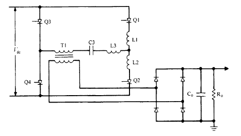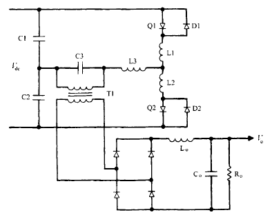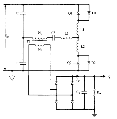 諧振型半橋電路 ( 圖 6.10 ) 和全橋電路 ( 圖 6.11 ) 是最有用的 SCR 電路。半橋電路僅用 兩個額定有效值為 SOOY 、45A 的 SCR ( Marconi ACR25U08LG ),就能夠從經(jīng)過整流的220V交流電網(wǎng)上獲取高達4kW的交流或直流輸出功率。若器件額定電壓為1200V,則用全橋電路能夠輸出8kW的功率。全橋電路的工作原理與半橋諧振電路類似,當(dāng)然若輸出相同功率,全橋電路中SCR接受的電壓應(yīng)力將是半橋的兩倍,電流應(yīng)力則為其一半。下面將細致引見半橋電路。半橋電路可工作于串聯(lián)負載狀態(tài) ,如圖 6.10 所示,次級負載經(jīng)過變壓器 Tl 折算到初級 與諧振電路發(fā)作串聯(lián)諧振(Ql導(dǎo)通時,Cl與L3和L1發(fā)作串聯(lián)諧振:Q2導(dǎo)通時,Cl與L3和L2發(fā)作串聯(lián)諧振) 。在串聯(lián)負載電路中 ,次級負載折算到初級的阻抗不能太高 ,否則諧振 電路的 Q 值太低 ,當(dāng)諧振電流反向時 ,原先導(dǎo)通的 SCR 就會無法牢靠關(guān)斷 。電路無需輸出 電感,因而在輸出高壓或低壓的場所都適用。正常工作時,由于負載和LC串聯(lián),與LC元件相比阻抗很小,所以該電路能夠平安地接受輸出端短路。但是該電路MOS管驅(qū)動輸出端不能開路 ,這 將在下面停止闡述 。
