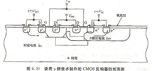 在CMOS應用中能同時將p溝道mos管與n溝道MOSFET制作在同一片芯片上.需要額外的摻雜及擴散步驟,以便在襯底中成“阱”或“盆(tub)”.阱中的摻雜種類與周圍襯底不同.阱的典型種類有p阱、n阱以及雙阱.阱技術的詳細內容將于第14章中討論.圖6. 31為使用p阱技術制作的CMOS反相器的剖面圖.在此圖中,p溝道與n溝道MoSFET分別制作于n型硅襯底以及p阱之中.