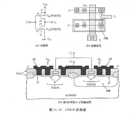 圖14. 23(b)為CMOS反相器的規劃.圖14.23(c)則為沿著A-A,的器件截面圖,在這個工藝中,先在n型襯底上停止p型注入摻雜而構成一個P型阱(或p型槽).p型摻雜濃度必需足夠高才干過度補償(overcompensate)n型襯底的背景濃度(backgrounddoping).關于p型阱的n溝道MOSFET,工藝則與前面所提過的相同,關于p溝道MOSFET而言,注入B、或(BF2)、離子至n型襯底構成源極與漏極,而As+離子則可用于溝道離子注入來調整閾值電壓及在p溝道器件左近的場氧化層下構成n+溝道阻斷,由于制造p溝道MOS-FET需求p阱和其他的步驟,所以制造CMOS電路的工藝步驟數是NMOS電路的兩倍,因而,我們在工藝復雜性與降低功率耗費間需有所取舍,