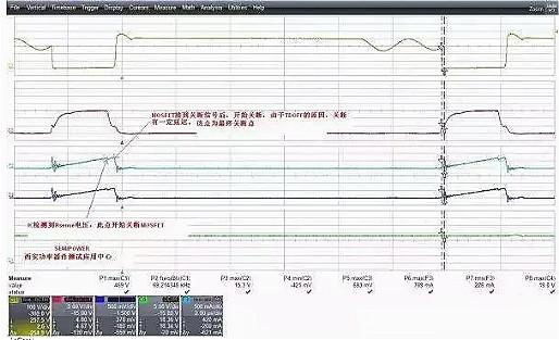 從圖中能夠看出,電流波形在快到電流尖峰時,有個下跌,這個下跌點后又有一段的上升時間,這段時間其實質就是IC在檢測到過流信號執行關斷后,MOSFET自身也開端執行關斷,但是由于器件自身的關斷延遲,因而電流會有個二次上升平臺,假如二次上升平臺過大,那么在變壓器余量設計缺乏時,就極有可能產生磁飽和的一個電流沖擊或者電流超器件規格的一個失效。