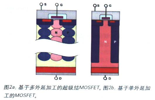 圖2‘給出了早期超級結器件的結構,傳統上它一直使用多外延工藝制造。豐富的N區域摻雜說明其比傳統平面晶體管有著了更低的電阻.P型區包圍N溝道的架構可以實現所需的擊穿電壓。