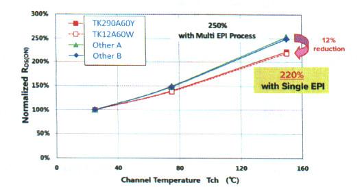單外延工藝也使超級結MOSFET對溫度變化時有著更穩定的性能,這有助于在更高工作溫度時維持功率變換器的效率。圖3說明了采用最新一代技術使器件標稱導通電阻在溫度變化顯著時減少,在150℃時導通電阻降低了12%。