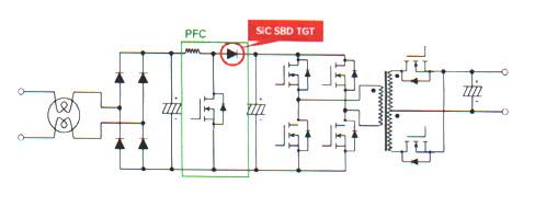 圖5:最新SiC=極管與高速超級結MOSFET結合使用可提高PFC電路的效率。