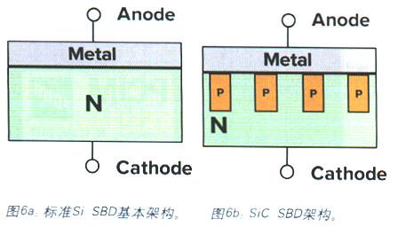 圖6a和6b給出了結構改進后的SiC SBD與標準Si SBD的結構對比。