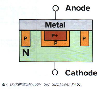 為了增加浪涌電流能力,并為電源應用提供更強大的器件,我們在第1代架構已進行改進并減少了調制的電導率(采用二極管正向電壓(VF)測試),從而實現更高的最大正向浪涌電流(IFSM).其中通過優化實現的P+區如圖7所示。