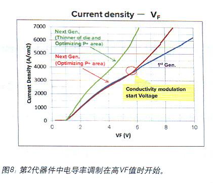 改變二極管結構改善了電流密度和VF之間的關系,提高了奠電導率調制開始出現的電壓,如8所示圖。這樣使器件有著較高IFSM.也使第2代架構的IFSM優于第1代器件。