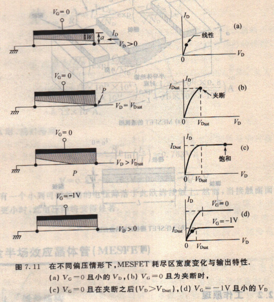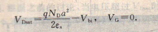 隨營(yíng)漏極電壓的持續(xù)增加,最終將使得耗盡區(qū)接觸到半絕緣襯底,如圖7.ll(b)所示.此現(xiàn)象的發(fā)生是當(dāng)漏傲9Vd有W=a.由式(7),令V=-VDsat,可以求出相對(duì)應(yīng)的漏極電壓值,稱為飽和電壓(sat uration voltage)VDsat: