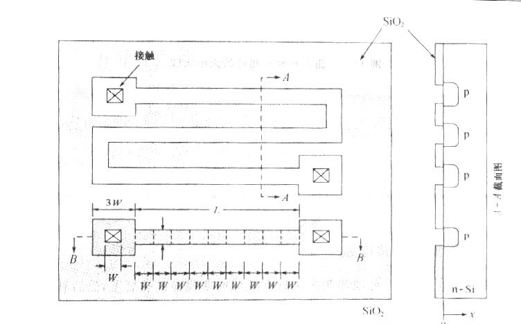 為了構成集成電路電阻,可以淀積一層具有阻值的薄膜在硅襯底上,然后運用圖形曝光技術和刻蝕定出其圖樣,也可以在生長于硅襯底上的熱氧化層上開窗,然后寫入(或是渙散)相反導電型雜質到晶片內,圖14.3閃現運用后者方法構成的兩個電阻的頂視圖和截面圖,一個是曲折型,另一個是直條型.