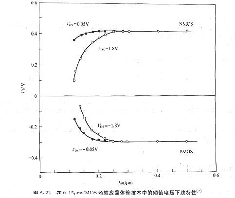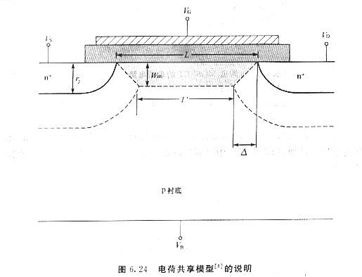 當溝道的邊緣效應變得不可疏忽時,隨著溝道的縮減,n溝道MOSFET的閾值電壓通常會變得不像原先那么正,而關于p溝道MOSFET而言,則不像原先那么負,圖6.23顯現了在VDS=o.05V時VT下跌的現象.閾值電壓F跌可用如圖6.24所示的電荷共享(chargesharing)模型來加以解釋,此圖為一個n溝道MOSFET的剖面圖,且器件工作在線性區(VDs≤o.1V),因而漏極結的耗盡區寬度簡直與源極結相同.由于溝道的耗盡區與源極和漏極的耗盡區堆疊,由柵極偏壓產生的電場所感應生成的電荷可用這梯形區域來近似同等.