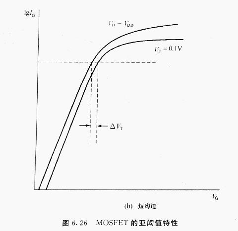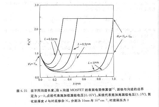 當短溝道MOSFET的漏極電壓由線性區增至飽和區時,其閾值電壓下跌將更嚴重(如圖6.23所示).此效應稱為舞場感應勢壘降落.數個不同溝道長度的n溝道器件的源極與漏極間的外表電勢如圖6.25所示,點線為VDS=o,實線為VDS>o.當柵極電壓小于VT時,p—型硅襯底在n+源極與漏極問構成一勢壘,并限制電子流由源極流向漏極.對工作在飽和區的器件而言,漏極結的耗盡區寬度遠大于源極結,在長溝道的例子中,增加漏極結耗盡區寬度并不會影響勢壘高度(參閱圖6.25中lμm的例子).但當溝道長度足夠短時,漏極電壓的增加將減小勢壘高度(圖6.25中o.3μm與o.5μm的例子),此歸因于漏極與源極太接近所形成的外表區的電場浸透,此勢牟降低效應會招致電子由源極注入漏極,形成亞閾值電流的增加.因而在短溝道器件中,閡值電壓會隨漏極電壓增加而降低.