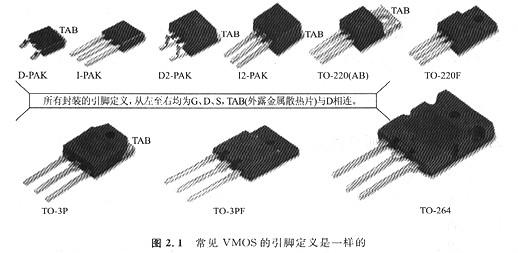 除了小型封裝的VMOS場以外,多數MOS場效應管單管的引腳排列順序是一樣的(圖2.1),極少有例外。讓VMOS的引腳向下,使有字的一面朝向自己,那么從左至右就是G(柵極)、D(漏極)、S(源極),TAB表示散熱片,與漏極相通。小型封裝、多管封裝等則需要查閱器件的技術手冊,沒有統一規律可循。