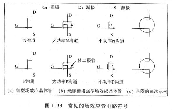 FET(場效應管)的種類繁多,電路原理圖的符號畫法也有很多種,好在差別都不大,常用的JFET和增強型VMOS的畫法如圖1.33所示。
