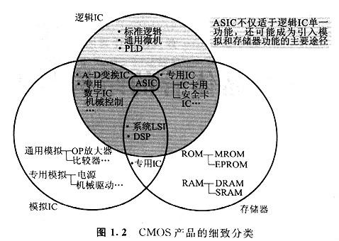 如圖1.1所示,CMOS產品能夠分為模仿(線性)IC,邏輯IC和存儲器。邏輯IC中包含標準邏輯lC、PLD(Programmablc LOgic Device)、ASIC(Application SpecificIC)/定制LSI、專用)C、微處理器,DSP(Digital Signal Processor),以及體系LSI等。
