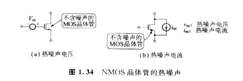 如圖1. 34(a)所示,MOS晶體管的熱噪聲可以用不含熱噪聲的MOS晶體管以及與柵極連接的電壓源束表示。這時,強反型的飽和區中MOS晶體管的熱噪聲