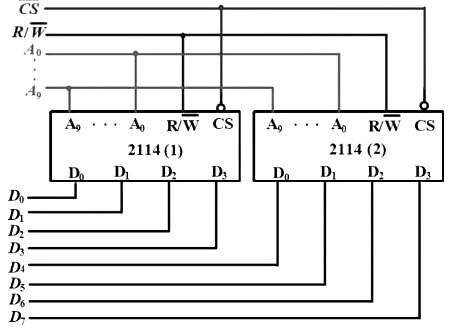 例:用2片2114(1024×4bit)RAM構(gòu)成1024×8bit的RAM
