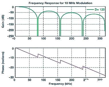 改善隔離系統線性度的一種常見方法是將ADC移至隔離柵的另一側并隔離數字信號。在許多情況下,這需要將串聯ADC與數字信號隔離器結合使用。由于對電機電流反饋存在高頻的特殊要求,以及需要對驅動保護進行快速響應,因此可選擇Σ-Δ型ADC。Σ-Δ型ADC配有一個可將模擬信號轉換為一位碼流的線性調制器,其后配備可將信號重構為高分辨率數字字的數字濾波器。此方法的好處是可使用兩種不同的數字濾波器:較慢的用于高保真反饋,另一個低保真快速濾波器用于保護逆變器。在圖2中,繞組分流器用于測量電機繞組電流,隔離式ADC用于在隔離柵上傳輸10 MHz數據流。Sinc濾波器可將高分辨率電流數據提交給電機控制算法,該算法會計算施加所需逆變器電壓需要的逆變器占空比。另一個低分辨率濾波器可檢測電流過載,并在出現故障時將跳變信號發送至PWM調制器。Sinc濾波器頻率響應曲線解釋說明了合適的參數選擇如何能夠使濾波器抑制電流采樣中的PWM開關紋波。