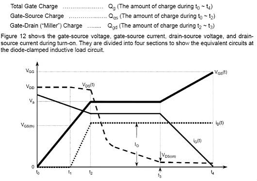 Qgs從0電荷開始到第一個拐點處,Qgd是從第一個拐點到第二個拐點之間部分(也叫做“米勒”電荷),Qg是從0點到vGS等于一個特定的驅動電壓的部分。