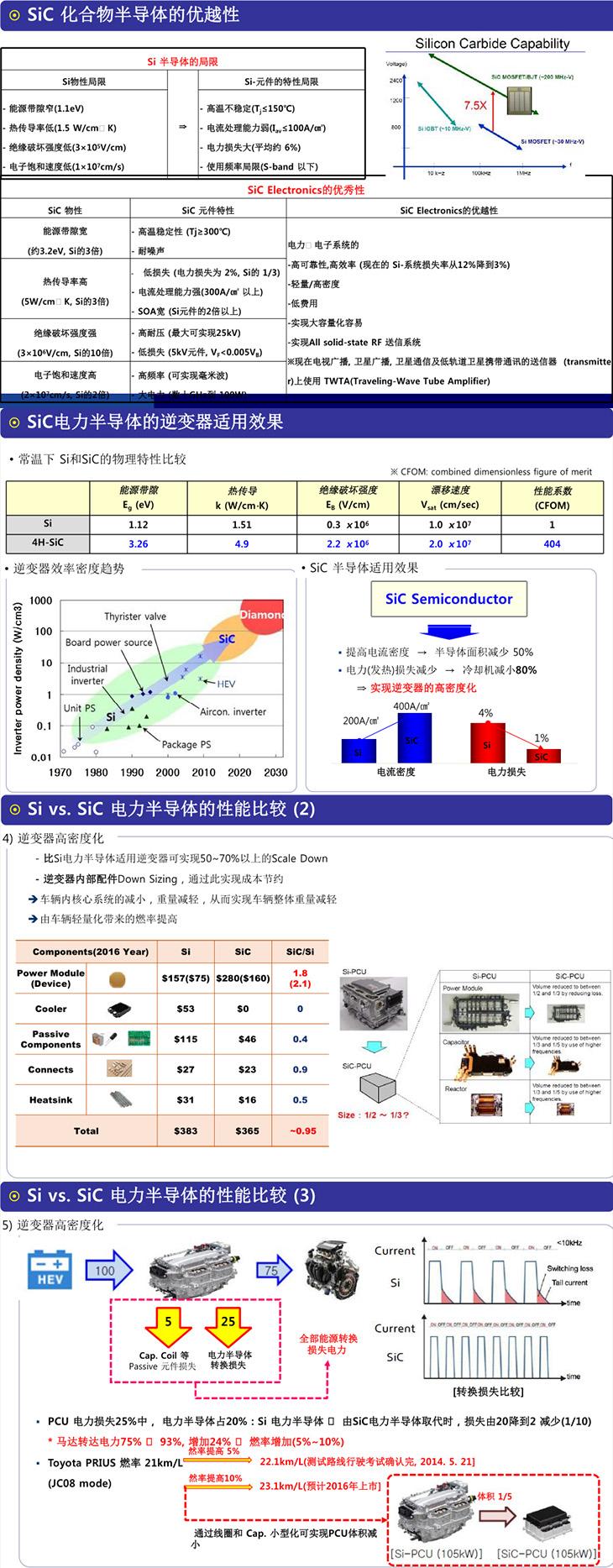 具 體來看,其整體優勢主要體現在下面幾個方面:一是SiC功率器件帶來開關損耗的大幅降低,可以大大提高系統的效率;二是因為SiC器件無反向恢復、散熱性 能好等特點,減少周邊器件的使用或者采用體積較小的器件,線路也得到優化,從而在整體上縮減了系統尺寸;最后,因為效率提高、器件精簡從而獲得了系統整體 成本的節約。