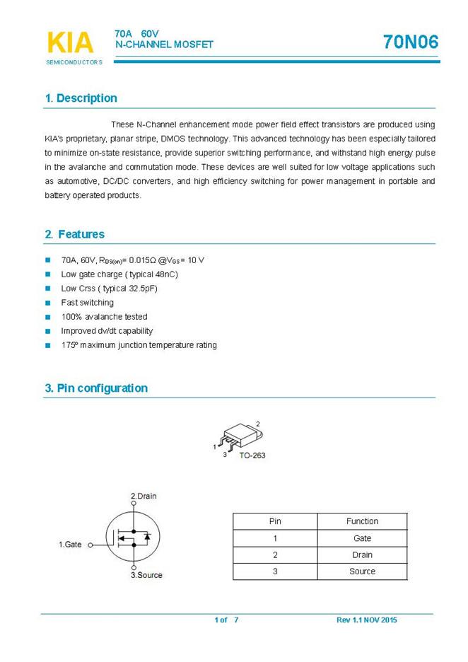 參數: ID(A): 70    BVDSS(V): 60    RDS(ON): 0.015    Qg(nC): 40    Package: TO-263