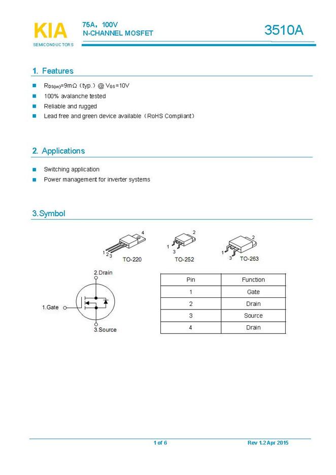 參數: ID(A): 75    BVDSS(V): 100    RDS(ON): 0.009    Qg(nC): 60    Package: TO-252、TO-263、TO-220