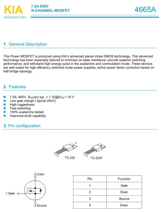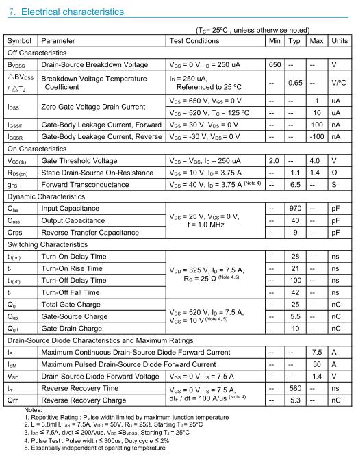 參數: ID(A): 7.5 BVDSS(V): 650 RDS(ON): 1.4 Qg(nC): 25 Package: TO-220F