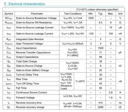 參數(shù): ID(A): 2.8A BVDSS(V): 1500V RDS(ON): 6.5 Qg(nC): 35 Package: TO-3PF