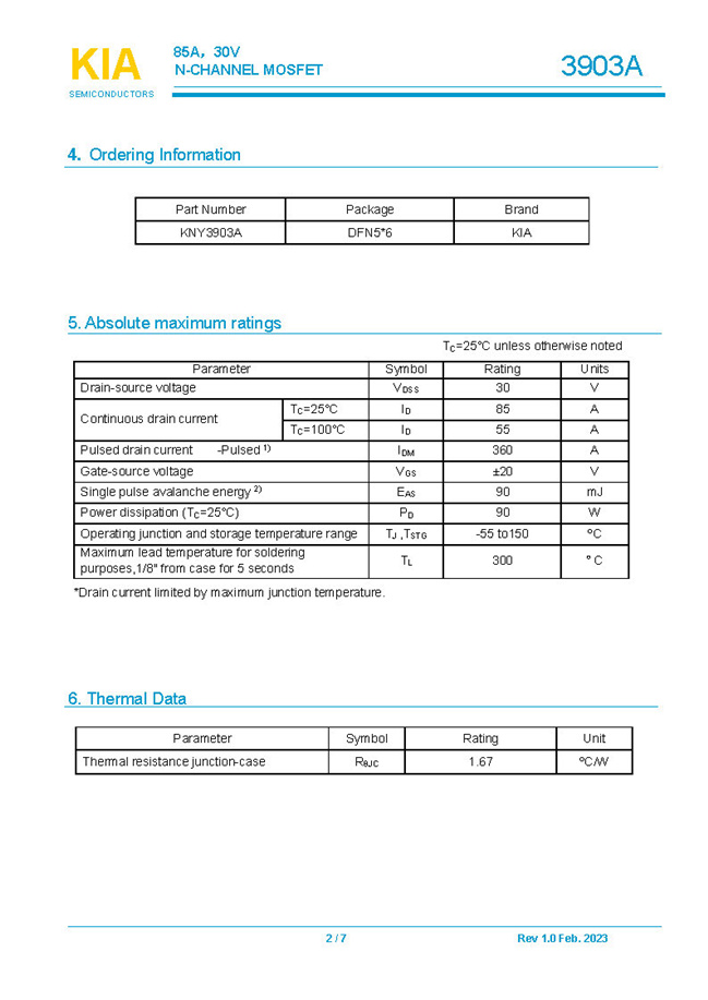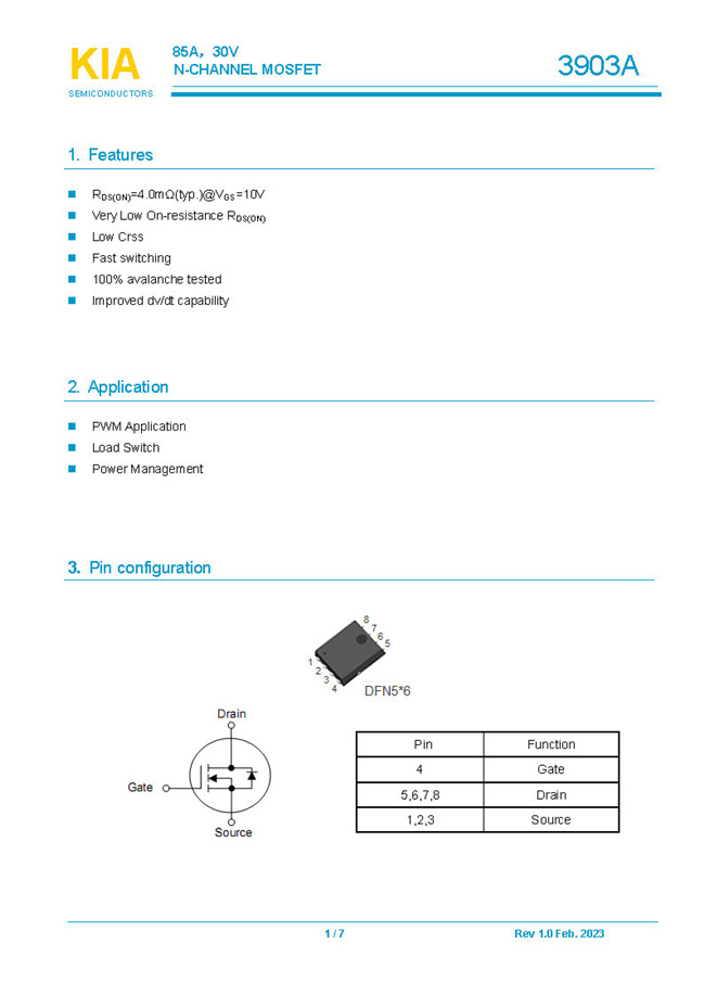 參數: ID(A): 85 BVDSS(V): 30 RDS(ON): 4 Qg(nC): 40 Package: DFN5*6
