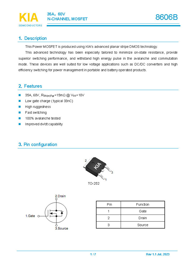 參數: ID(A): 35    BVDSS(V): 60    RDS(ON): 15mΩ    Qg(nC): 33    Package: TO-252