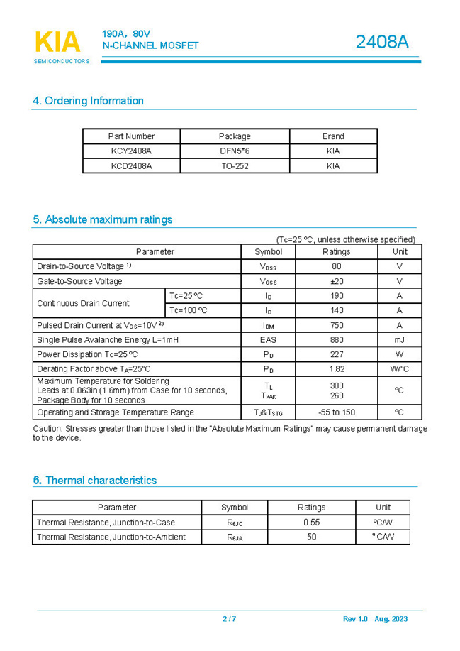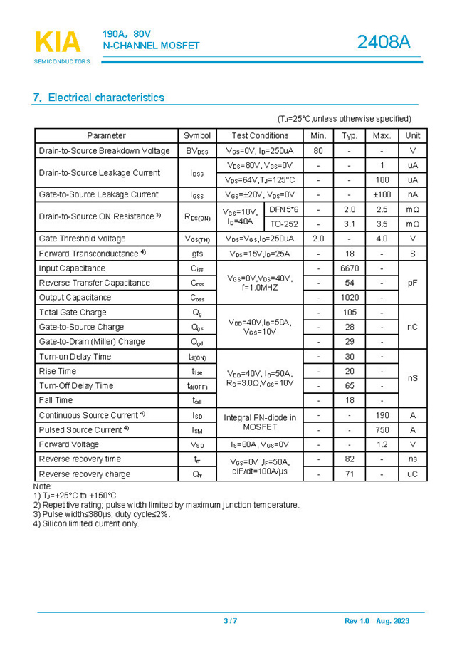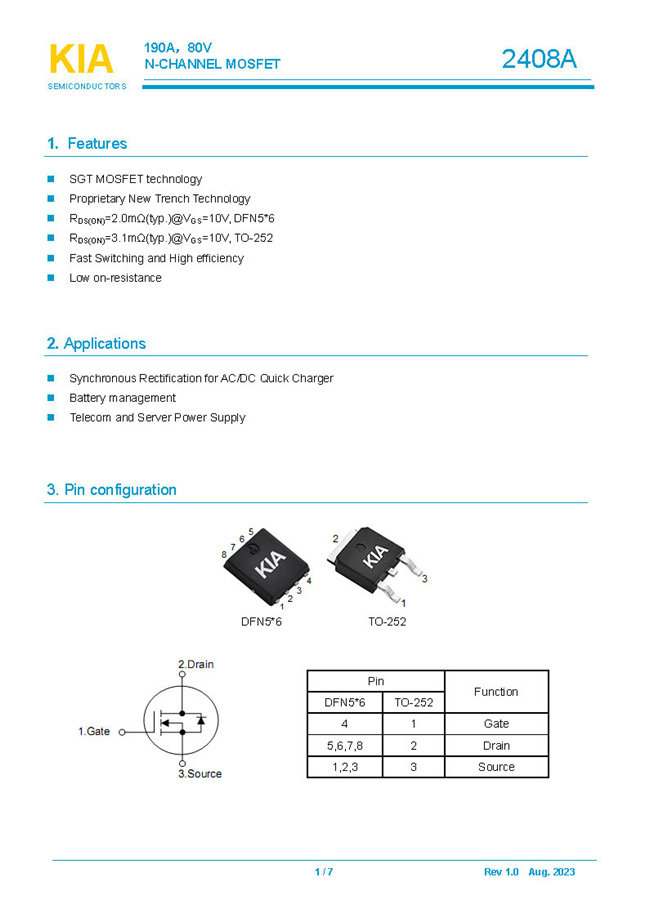 參數: ID(A): 190    BVDSS(V): 80    RDS(ON): 3mΩ    Qg(nC): 105    Package: TO-252.DFN5*6