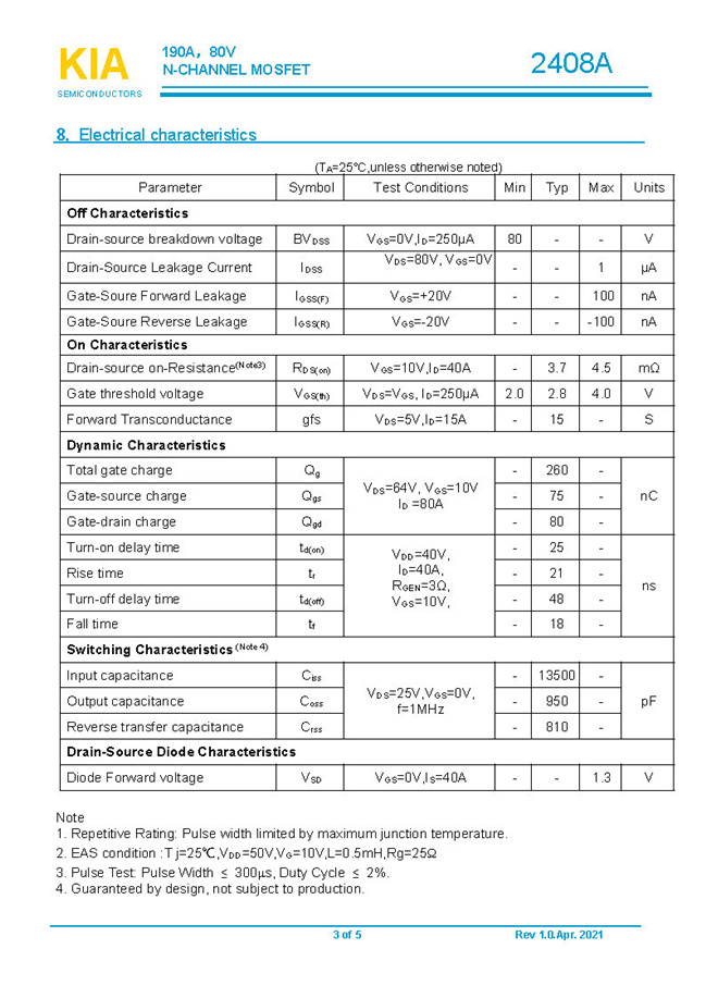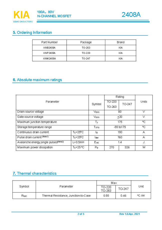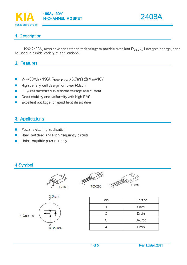 參數: ID(A): 190    BVDSS(V): 80    RDS(ON): 3.7mΩ    Qg(nC): 260    Package: TO-220.TO-263.TO-247