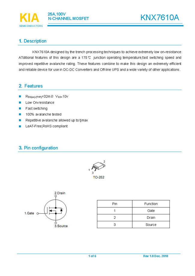 參數: ID(A): 25 BVDSS(V): 100 RDS(ON): 32mΩ Qg(nC): 55 Package: TO-252