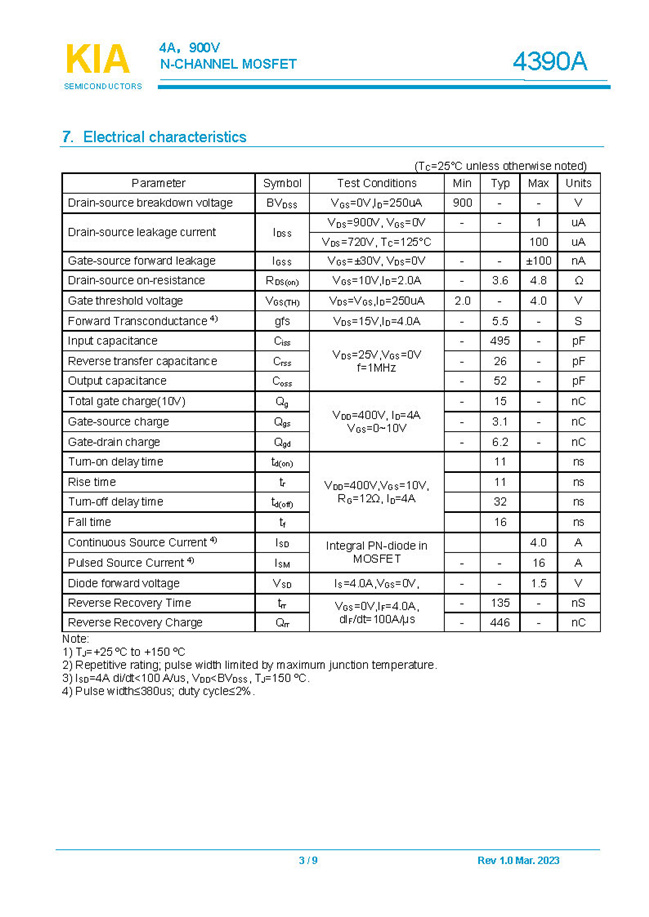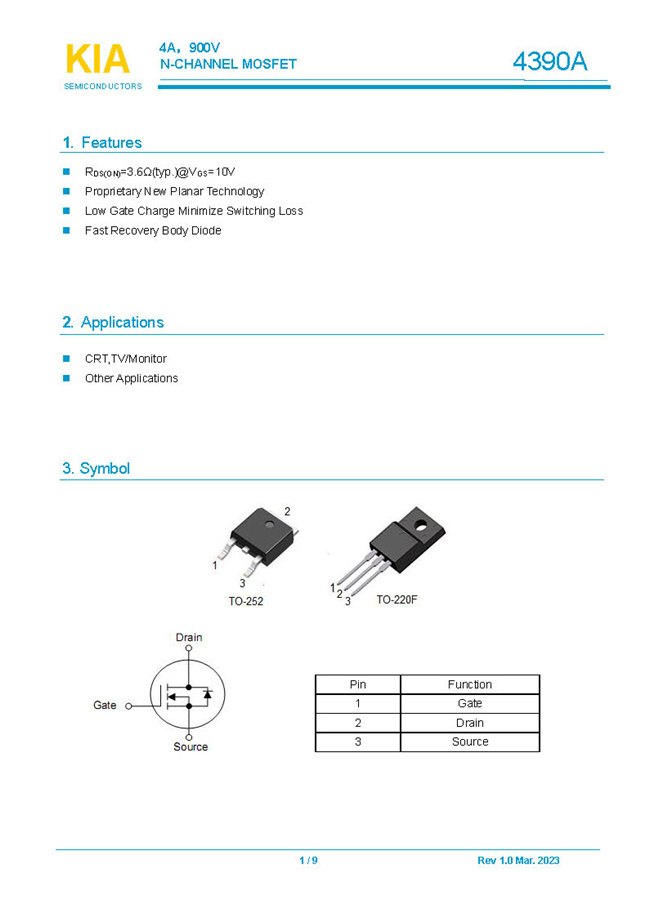 參數: ID(A): 4    BVDSS(V): 900    RDS(ON): 3.6Ω    Qg(nC): 15    Package: TO-252.TO-220F