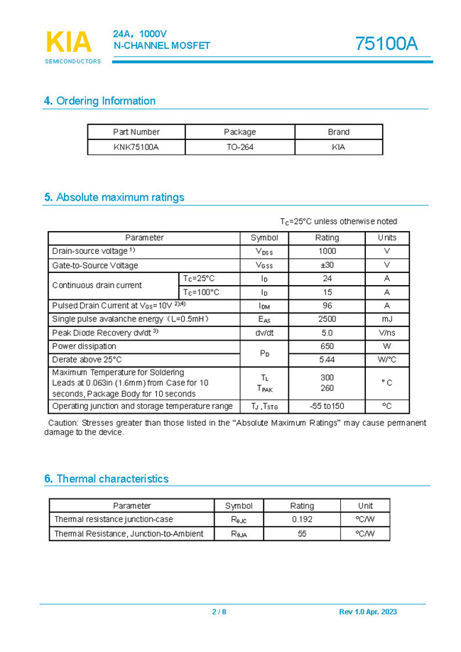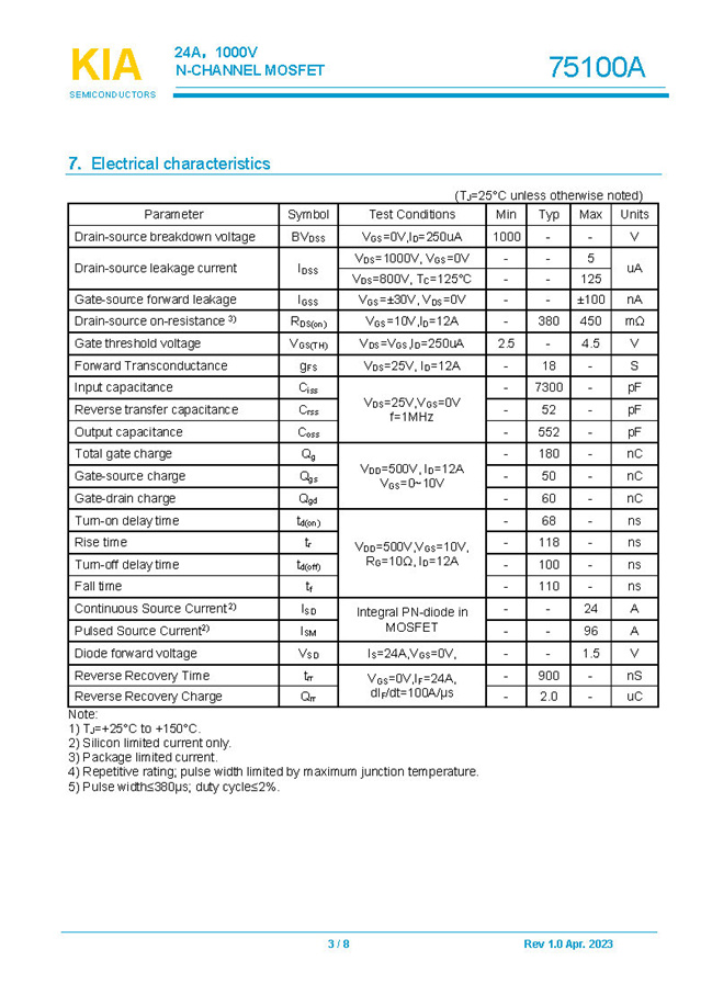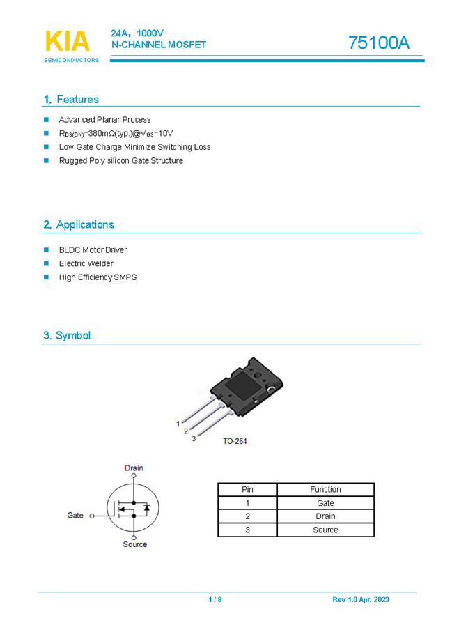 參數: ID(A): 24    BVDSS(V): 1000    RDS(ON): 380mΩ    Qg(nC): 180    Package: TO-264