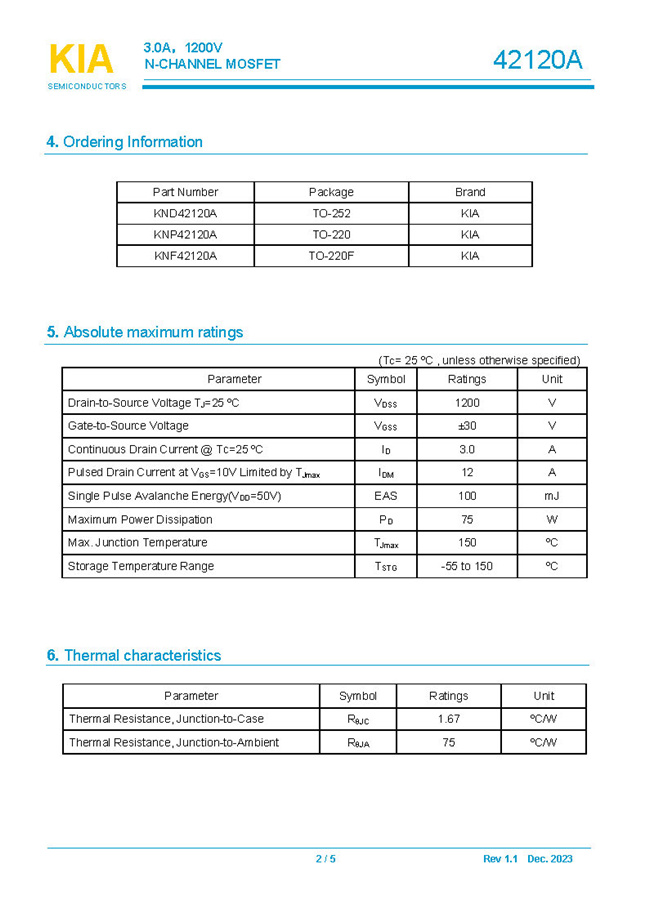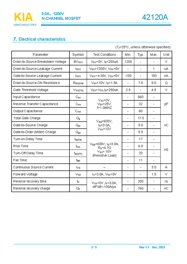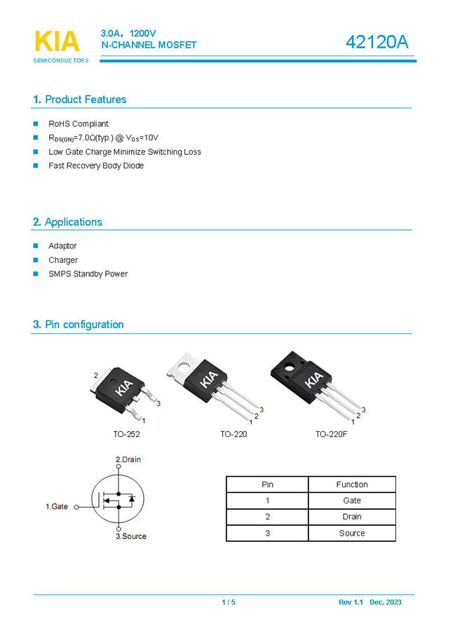 參數(shù): ID(A): 3 BVDSS(V): 1200 RDS(ON): 7.0Ω Qg(nC): 17.5 Package: TO-252.TO-220.TO-220F
