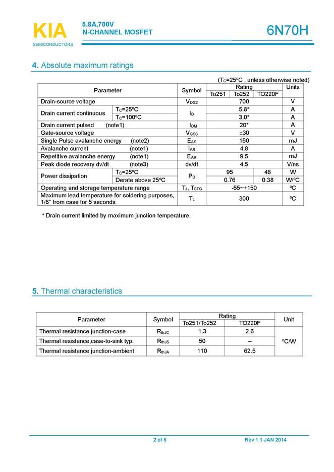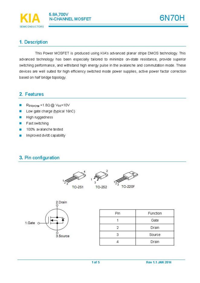 參數: ID(A): 5.8 BVDSS(V): 700 RDS(ON): 2.3 Qg(nC): 16 Package: TO-251、TO-252、TO-220F