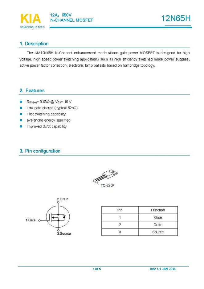 參數: ID(A): 12 BVDSS(V): 650 RDS(ON): 0.72 Qg(nC): 52 Package: TO-220F