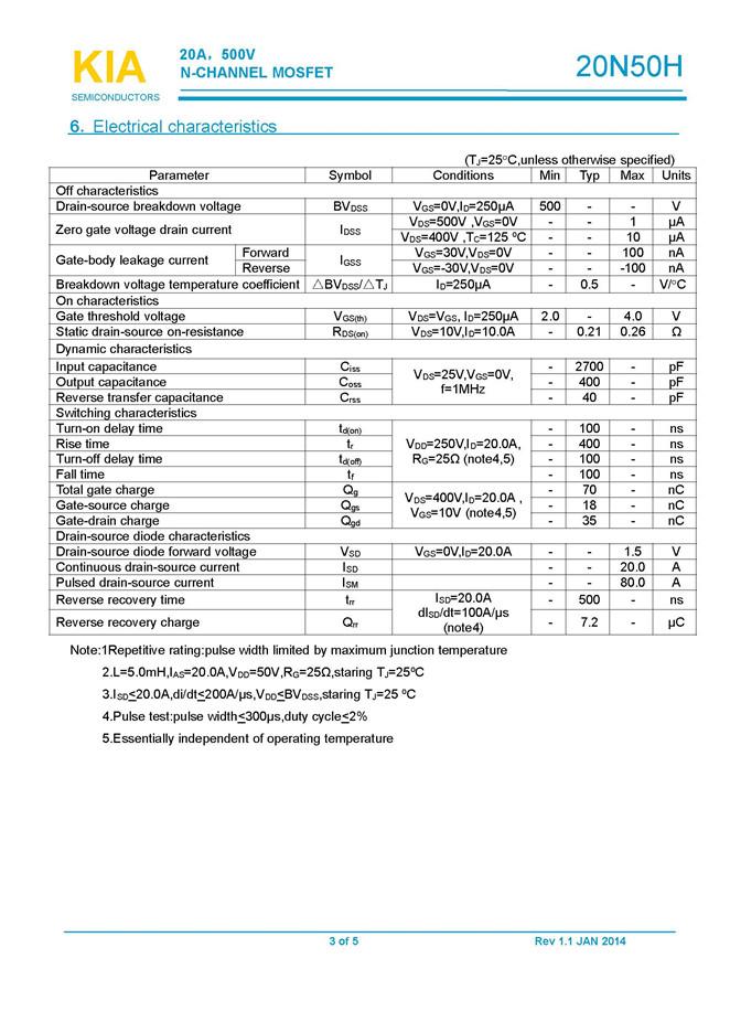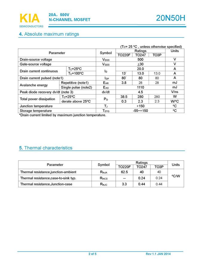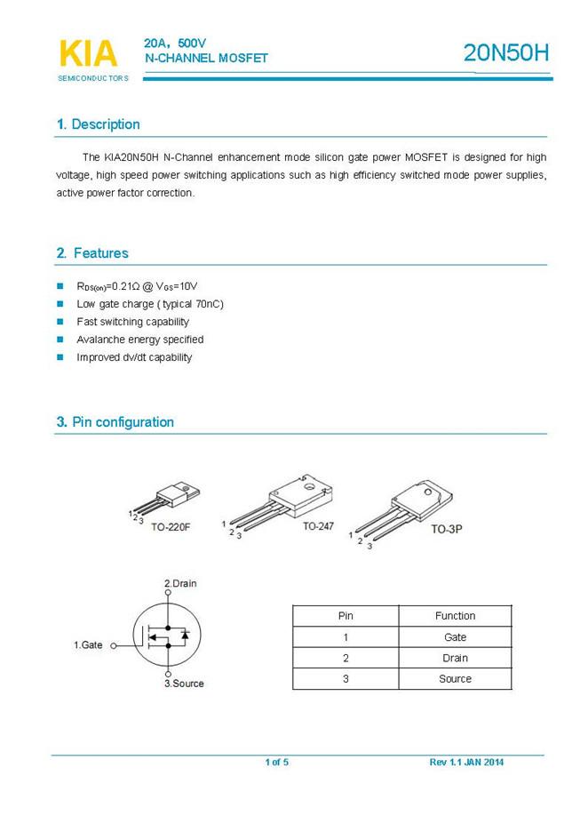 參數: ID(A): 20 BVDSS(V): 500 RDS(ON): 0.26 Qg(nC): 70 Package: TO-220F、TO-3P、TO-247